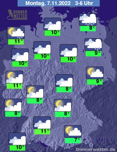 In der Nacht zum Montag fällt im Norden unter dichten Wolken gebietsweise Regen. Von der breiten Mitte des Landes bis in den Süden ist es teils stark, teils aufgelockert bewölkt und dazu trocken. Die Temperatur sinkt auf 11 Grad in Köln und etwa 7 Grad in München. Im Norden weht ein teils stürmischer Wind, an den Küsten von Nord- und Ostsee herrscht teilweise Sturm.