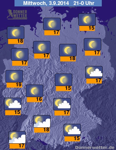 Heute Abend lockert auch die Bewölkung am Alpenrand und dem Schwarzwald langsam auf und es bleibt hier, so wie im übrigen Deutschland, trocken. Im Süden und Richtung Erzgebirge ziehen meist nur lockere Wolkenfelder durch, in den übrigen Landesteilen sind die Sterne bei klarem Himmel meist sehr gut zu beobachten. In Köln ist die Abendtemperatur für den ein oder anderen noch T-Shirt tauglich, sonst ist bei 18 bis 15 Grad aber eher frühherbstliche Kleidung angesagt.