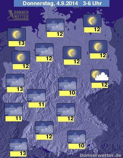 In der Nacht zum Donnerstag bleibt der Himmel von der Mitte bis in den Norden Deutschlands überwiegend klar, stellenweise kann sich jedoch Nebel oder Hochnebel bilden, dabei bleibt es aber trocken. Im Süden ziehen häufig auch dichtere Wolken durch, dabei sind am ehesten am Schwarzwald ein paar Tropfen möglich, sonst bleibt es trocken. Nebel kann sich jedoch auch hier bilden. Die Temperatur sinkt auf recht einheitliche 13 bis 10 Grad.