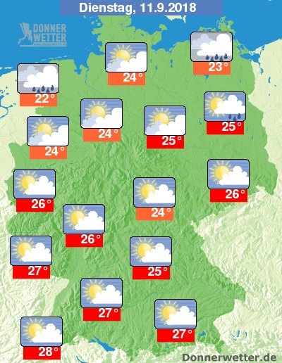 Heute dominiert nach Auflösung örtlicher Dunst- und Nebelfelder eine freundliche Mischung aus Sonne und Wolken. Lediglich im Küstenumfeld von Nord- und Ostsee, sowie große Teile Schleswig-Holsteins fällt aus dichten Schichtwolken gelegentlich Regen. Die Höchsttemperaturen liegen hier zwischen 20 und 23 Grad, im großen Restwerden wieder spätsommerliche 24 bis nahe 30 Grad erreicht.
