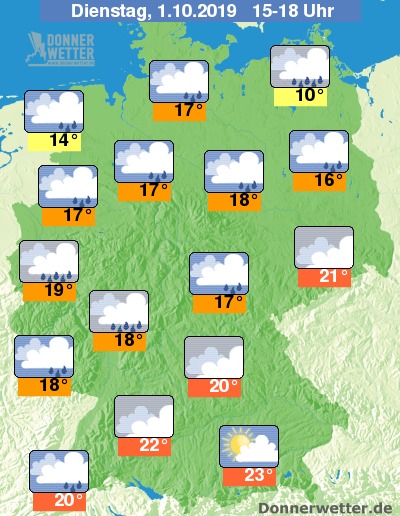 Die Temperaturen bewegen sich im Westen und Norden zwischen 15 und 19 Grad, im Nordosten, sowie an den Küsten bleibt es mit Werten zwischen 10 und 14 Grad kühler. Von Sachsen bis nach Bayern und ins östliche Baden-Württemberg können nochmals angenehme 20 bis 23 Grad erreicht werden.