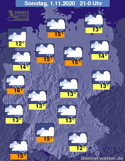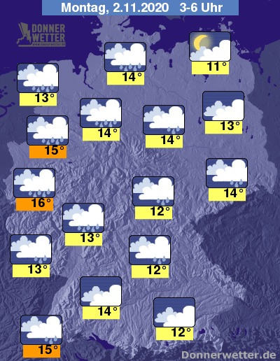 In der Nacht zum Montag bleibt es bedeckt und es fällt verbreitet zeitweise Regen, zum Morgen hin lässt der Regen zumindest im Süden und Westen etwas nach. Die Temperatur sinkt auf milde 16 Grad in Köln und bis 11 Grad in Neubrandenburg. Über dem Norden und Westen weht ein oft starker bis stürmischer Wind. Auf den Bergen der Mittelgebirge und an der Nordsee herrscht zum Teil Sturm.