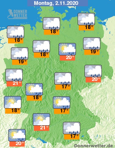 Am Montag ziehen zumeist dichte Wolken durch, dabei zieht ein Regenband anfangs nach Osten ab, danach bleibt es vorübergehend trocken, bevor zum Abend hin im Westen neuer Regen aufzieht. Die Temperatur steigt auf sehr milde 17 Grad im Eichsfeld und bis warme 21 Grad im Rhein-Main-Gebiet. Über der Nordwesthälfte des Landes weht ein starker bis stürmischer Wind, auf den Bergen und an der See herrscht zum Teil Sturm.