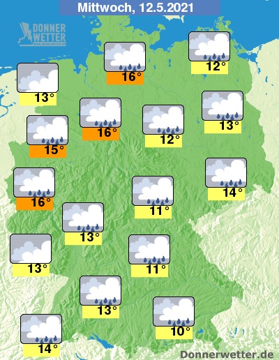 Heute halten sich im Land dichte Wolken, dabei fällt über der Südhälfte zeitweise, im übrigen Land fällt gelegentlich Regen. Die Temperatur steigt auf kühle 10 Grad in Berchtesgaden und bis 16 Grad im Norddeutschen Tiefland.