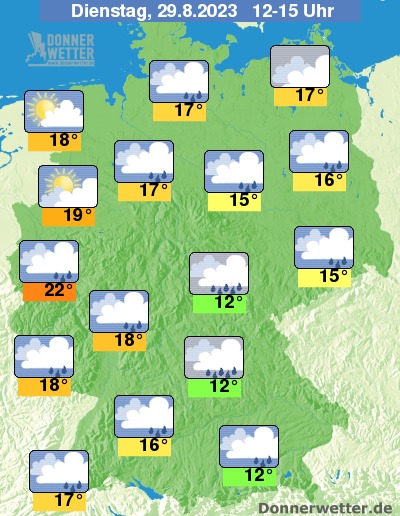Heute Nachmittag zeigt sich das Wetter häufig stark bewölkt oder bedeckt, dabei bilden sich gebietsweise Schauer oder es fällt Regen. Im Nordwesten des Landes scheint auch öfter die Sonne, hier bleibt es meist trocken. Die Temperatur liegt bei nasskalten 12 Grad in Oberbayern und etwa 22 Grad im Rheinland.