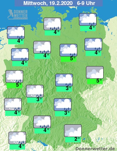 Die Wochenmitte startet über weiten Landesteilen mit einer geschlossenen Wolkendecke und immer wieder fällt Regen, vor allem in der Südwesthälfte auch mit Schneeregen oder Schnee durchmischt. Meist trocken bleibt es in den Frühstunden nur am Alpenrand und im äußersten Südosten. Die Temperaturen liegen um 2 bis 5 Grad.