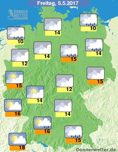 Der Regen im Norden lässt allmählich nach und die Schauer im Süden und in der Mitte werden seltener. Im Tagesverlauf lösen sich die Wolken gebietsweise auf und machen der Sonne Platz. Dabei liegen die Höchsttemperaturen im äußersten Norden zwischen 10 und 14 Grad, sonst werden zwischen 14 und 18 Grad erreicht. Die Nacht auf Samstag wird in großen Teilen klar, nur im Nordosten bleibt es noch bewölkt.