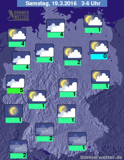 In der Nacht zum Samstag bleibt es im Süden weitgehend klar und trocken, im Norden und Osten ist es meist locker bis aufgelockert bewölkt und ebenso trocken. Oft dichte Wolken halten sich hingegen vom Westen bis ins Landesinnere, sowie auch im Nordwesten Deutschlands, hier ist gelegentlich auch ein wenig Regen oder Sprühregen möglich, meist ist es jedoch trocken. Die Temperatur sinkt auf 5 Grad in Aachen und etwa 0 Grad im nördlichen Brandenburg.