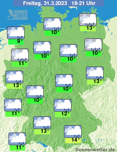 Heute Abend bleibt es weiterhin bedeckt, im Süden bilden sich noch gebietsweise Schauer, sonst fällt zeitweise Regen. Die Temperatur liegt bei 9 Grad in Wilhelmshaven und 14 Grad im Raum München.
