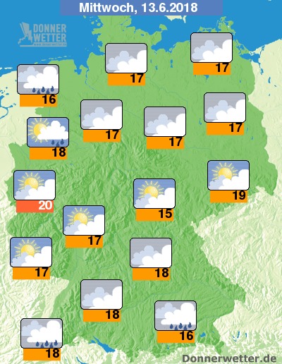 Vom Bodensee bis zum Bayrischen – Wald fällt noch gelegentlich Regen. In Alpennähe regnete es zum Teil sehr intensiv mit Überschwemmungsgefahr. Im großen Rest dominieren zwar auch eher die Wolken, Regenschauer treten jedoch nur im Norden vereinzelt auf. Über der Mitte gibt es zwischendurch auch größere Aufheiterungen. Die Höchsttemperaturen liegen allgemein zwischen 15 und 22 Grad. Unter den dichten Regenwolken im Südosten bleibt es kühler. Der Wind weht meist nur schwach bis mäßig und kommt aus nördlichen, in Norddeutschland aus westlichen bis nordwestlichen Richtungen.