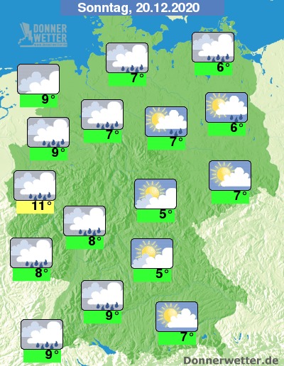 Am Sonntag im Osten und Südosten ist es zum Teil heiter, sonst ziehen aber überwiegend dichte Wolken durch, dabei fällt in einem Band von Südwest- bis Nordostdeutschland gebietsweise Regen, sonst bleibt es hingegen weitgehend trocken. Die Temperatur steigt auf 5 Grad im Grabfeld und bis 11 Grad in der Kölner Bucht.