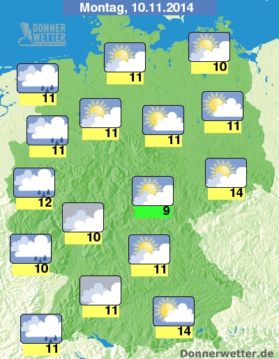 Der Start in die neue Woche beginnt verbreitet mit vielen Wolken, dabei kann sich vor allem in der Osthälfte des Landes aber auch immer wieder mal die Sonne zeigen und es bleibt hier weitgehend trocken. In einem breiten Streifen von der Nordsee, über das westliche Niedersachsen, NRW, Rheinland-Pfalz, das Saarland bis nach Baden-Württemberg halten sich dagegen zumeist dichte Wolken aus denen zeitweise auch Regen fällt. Die Temperatur steigt auf 9 Grad am Odenwald und bis 14 Grad in Berchtesgaden.