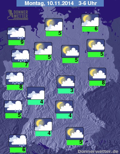 In der kommenden Nacht werden die Wolken zwischen der Nordsee, dem Westen Deutschlands bis zum Breisgau noch dichter und es setzt zeitweiliger Regen ein, weiter nach Osten bleibt es dagegen aufgelockert bis stark bewölkt und trocken. Im Osten und Südosten bildet sich stellenweise Nebel oder Hochnebel. Die Temperatur sinkt auf 9 Grad an der Nordsee und etwa 3 Grad am Thüringer Schiefergebirge.