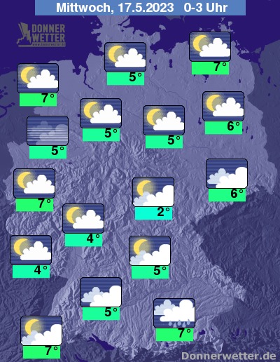 In der Nacht auf Mittwoch zeigt sich der Himmel meist locker oder aufgelockert bewölkt, stark bewölkt bleibt der Himmel über Teilen Sachsens sowie südlich der Donau. Am Alpenrand fällt anhaltender Regen, oberhalb von 1000 Metern auch Schnee; in den übrigen Landesteilen bleibt es meist trocken.