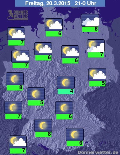 In der Nacht zum Samstag bleibt es in der Mitte und im Süden oft sternenklar, stellenweise bildet sich jedoch Nebel oder Hochnebel, dazu bleibt es trocken. Im Nordwesten ziehen dagegen dichte Wolken und zeitweiliger Regen auf, der bis zum Morgen etwa eine Linie Rheinland - südliches Niedersachsen - Rügen erreicht. Im Osten Deutschlands ist es locker bis aufgelockert bewölkt und es bleibt trocken. Die Temperatur sinkt auf 6 Grad an der Nordsee und bis 1 Grad im Grabfeld.