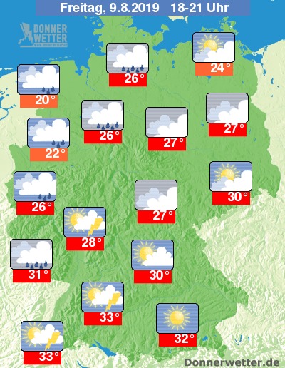 Am frühen Abend bewegen sich Temperaturen bei recht kühlen 20 Grad an der Emsmündung und sehr heißen 33 Grad vor den Gewittern in Teilen von Baden-Württemberg.