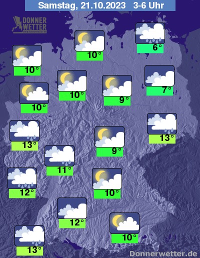 In der kommenden Nacht ziehen teils dichte Wolken durch, die zeitweise Regen bringen. Gebietsweise lockert es aber auch auf und es gibt längere Regenpausen. Die Temperatur sinkt auf 13 Grad am Oberrhein und bis 6 Grad an der Müritz. An den Küsten ist es anfangs noch oft stürmisch, bis zum Morgen lässt der Wind allerdings deutlich nach.