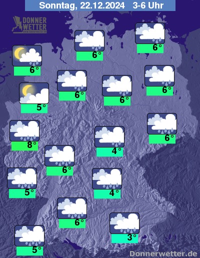 In der Nacht zum Sonntag ist der Himmel meist bedeckt, dabei fällt verbreitet Regen, im Südwesten auch länger anhaltend. In den höchsten Lagen Schneefall. In der Nordhälfte geht der Regen in den frühen Morgenstunden in Schauer über, auch einzelne Gewitter sind möglich.