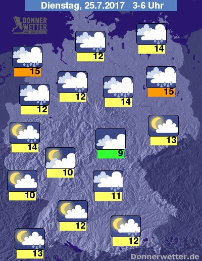 In der Nacht zum Dienstag bleibt der Himmel bedeckt und hier fällt zum Teil langanhaltender und ergiebiger Regen. Sonst ist es auch gebietsweise stark, teils aber auch nur leicht bis aufgelockert bewölkt, dabei bilden sich vereinzelt Schauer und nur selten auch Gewitter. Die Temperatur sinkt auf 15 Grad in Emden und bis 9 Grad im Grabfeld.