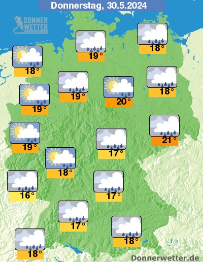 Am Donnerstag zeigt sich der Himmel über dem Westen und Nordwesten überwiegend wechselnd, sonst stark bewölkt oder bedeckt. Verbreitet muss am Donnerstag mit Schauern und Gewittern gerechnet werden, lokal auch Starkregen.