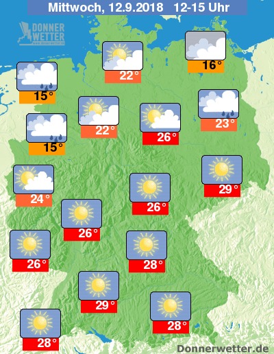 Im Nordwesten und Norden dominieren am frühen Nachmittag abgesehen von kurzen Auflockerungen meistens dichtere Wolken und gelegentlich fällt auch Regen. Sonst strahlt jedoch verbreitet wieder die Sonne von einem meist nur leicht bewölkten Himmel. Die Temperaturen bewegen sich unter den Wolken meist nur zwischen kühlen 15 und 20 Grad. Sonst werden aber verbreitet 21 bis 26 Grad erreicht. Im Süden und Südwesten kann das Quecksilber bis an die 30 Grad - Marke klettern.