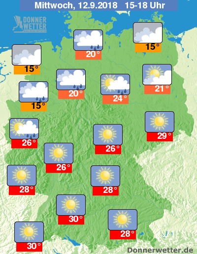 Im Laufe des Nachmittags kommt der Regen bis zur Kölner Bucht und zu den nördlichen Mittelgebirgen voran und es bleibt recht kühl. Dahinter lockert die Bewölkung zum Abend allmählich auf. Von der Eifel, über Hessen bis nach Sachsen bleibt es sonnig und trocken bei spätsommerlichen Temperaturen von 26 bis 30, im Südwesten stellenweise auch bis 32 Grad.