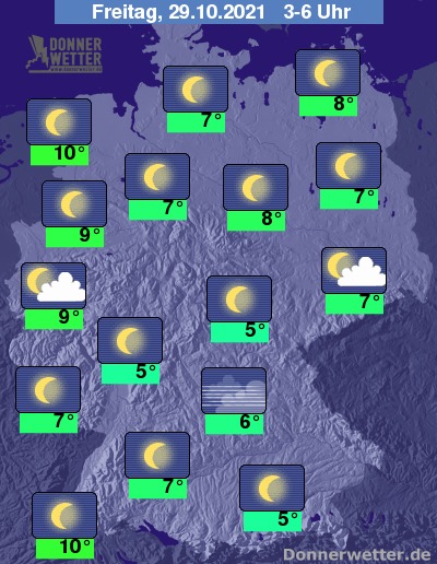 In der bevorstehenden Nacht können hier und da mal lockere Wolken durchziehen, meist bleibt der Himmel aber sternenklar, dazu bleibt es trocken. Die Temperatur sinkt auf10 Grad in Freiburg und bis etwa 5 Grad in Jena.