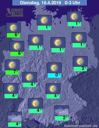 Die Temperaturen sinken bis in die frühen Morgenstunden auf Werte um 5 Grad im Breisgau und um -2 Grad C im Thüringer Wald.