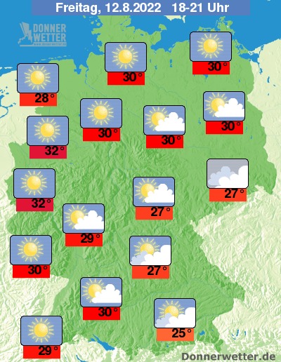 Heute Abend ist es weiterhin überwiegend sonnig oder es ziehen nur wenige Wolken durch. Im Südosten und über Sachsen ziehen gebietsweise auch viele und teils dichte Wolken durch, dabei besteht nur ein geringes Schauerrisiko. Im übrigen Land bleibt es komplett trocken bei Werten von 25 Grad in Augsburg und 32 Grad in Bonn.