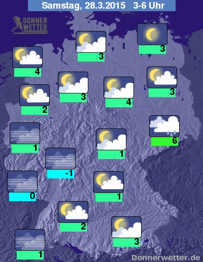 In der Nacht zum Samstag klart der Himmel sowohl in der Südwesthälfte als auch im Nordosten des Landes verbreitet auf, gebietsweise halten sich auch lockere Wolken, dazu bildet sich stellenweise jedoch Nebel oder Hochnebel. In Niedersachsen bleibt es häufig stark bewölkt, in Sachsen-Anhalt und Sachsen auch oft bedeckt, hier ist gelegentlich Regen oder Sprühregen möglich, sonst bleibt es trocken. Die Temperatur sinkt auf 6 Grad in Dresden und bis -1 Grad im Siegerland.