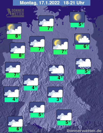 Heute Abend ist es im Nordosten und im Verlauf auch im Osten oft locker bewölkt oder auch sternenklar. Im übrigen Land bleibt es bedeckt oder neblig-trüb, dabei fällt über Bayern und anfangs über Sachsen gebietsweise Regen oder Schneeregen, sonst bleibt es weitgehend trocken. Die Temperatur liegt bei 3 Grad in Unterfranken und bis 8 Grad im Emsland.