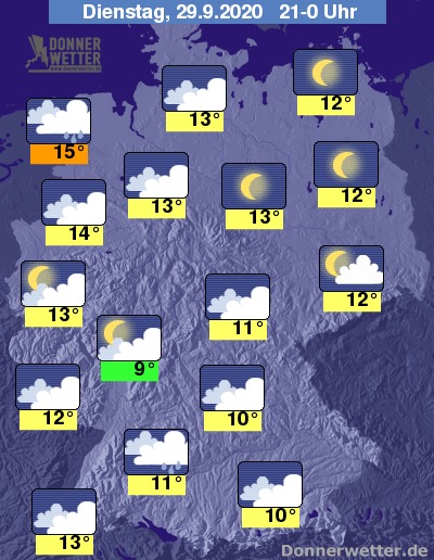 Bis Mitternacht tröpfelt es nur noch selten und die Wolkendecke bekommt stellenweise Lücken. Im Nordosten präsentiert sich der Himmel häufig sternenklar oder nur leicht bewölkt.