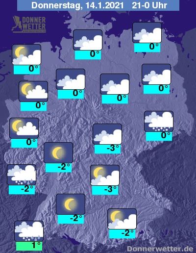 Am Abend fällt dort wo Frankreich und die Schweiz nahe sind noch Schnee oder Schneeregen, auch am Erzgebirge kann es noch flocken. Sonst bleibt es überwiegend trocken. Teilweise bleibt die Bewölkung dicht, teilweise lassen sich einige Sterne beobachten. Es muss gebietsweise mit Glätte gerechnet werden.