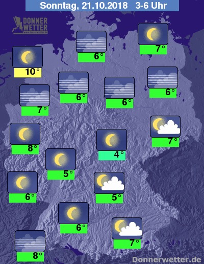In der kommenden Nacht klart der anfangs noch teils stärker bewölkte Himmel verbreitet auf, es bildet sich gebietsweise Nebel oder Dunst, jedoch bleibt es trocken. Die Temperatur sinkt auf 10 Grad in Bremerhaven und bis 4 Grad im Grabfeld.