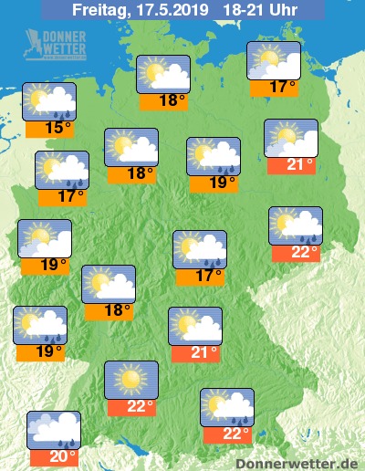 Am Abend gestalte sich der Himmel wechselnd wolkig, teilweise sind die Wolken dichter, teilweise gibt es größere Aufheiterungen. Örtlich fällt Regen oder es treten Schauer und einzelne Gewitter auf.