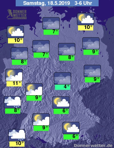 Während der zweiten Nachthälfte bleibt es bis auf wenige Schauer im Südwesten überwiegend niederschlagsfrei. In der sich abkühlenden und zunehmend feuchter werdenden Luftmasse können sich jedoch vor allem im Norden und in der Mitte Nebelfelder ausbreiten. Sonst zeigen sich bei meist nur lockeren Wolkenfeldern teilweise Mond und Sterne.