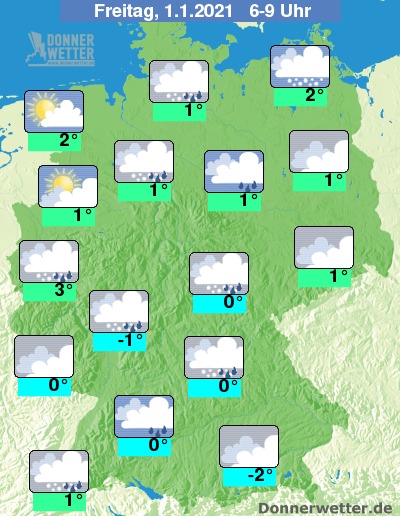 Der Neujahrstag startet vielerorts mit einer geschlossenen Wolkendecke, einzelne Auflockerungen beschränken sich am Morgen auf den Nordwesten des Landes. Verbreitet muss in den Frühstunden mit Schauern gerechnet werden, die auch bis in tiefe Lagen als Schnee fallen können.