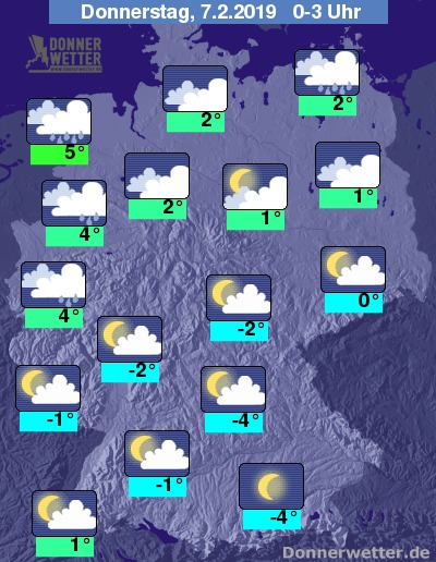 In der Nacht ist der Himmel im Norden und Nordwesten meist dicht bewölkt oder bedeckt, zwischen Niederrhein und Nordseeküste sowie an der Ostseeküste muss dabei mit zum Teil kräftigen Schauern gerechnet werden. Im Süden und Osten bleibt es meist locker bewölkt und es ist trocken.