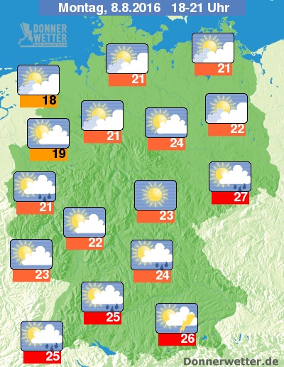 Heute Abend bilden sich über dem Süden und über Sachsen teils kräftige Schauer oder Gewitter, im übrigen Bundesgebiet ist es hingegen verbreitet heiter oder wechselnd bewölkt, dabei bleibt es auch weitgehend trocken. Die Temperatur liegt bei 18 Grad an der Nordsee und bis 27 Grad in Görlitz.