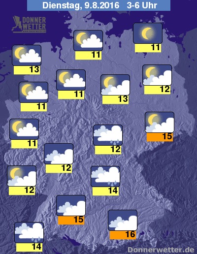 In der Nacht zum Dienstag ist es über der Südhälfte Deutschlands oft stark, hier und da aufgelockert bewölkt, dazu bilden sich gebietsweise einzelne Schauer, seltener auch Gewitter. Weiter nach Norden hin ist es meist nur locker, teilweise aufgelockert bewölkt und es bleibt verbreitet trocken. Die Temperatur sinkt auf 16 Grad in München und bis 11 Grad an der Weser.