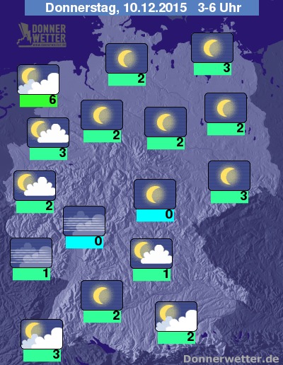 In der Nacht zum Donnerstag ist es über Bayern und Sachsen anfangs meist stark bewölkt, dabei bleibt es aber schon überwiegend trocken, bis zum Morgen klart der Himmel dann auf. Im übrigen Bundesgebiet ist es dagegen zunächst verbreitet sternenklar, in der zweiten Nachthälfte ziehen im Norden und Westen aber auch einige, meist lockere Wolken auf, dazu bleibt es aber trocken. Die Temperatur sinkt auf 6 Grad an der Nordsee und bis 0 Grad am Spessart. Stellenweise bildet sich Nebel oder Hochnebel, dabei ist teils Rauhreif möglich.