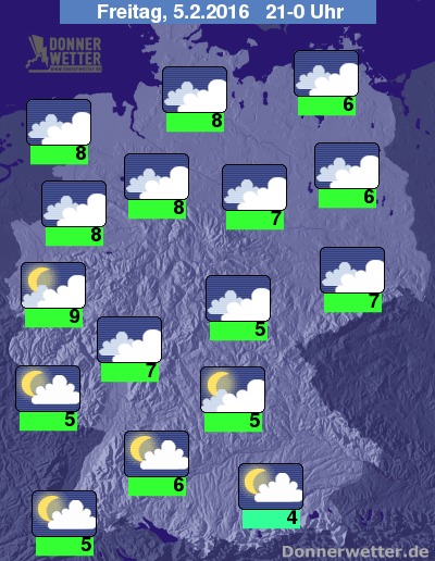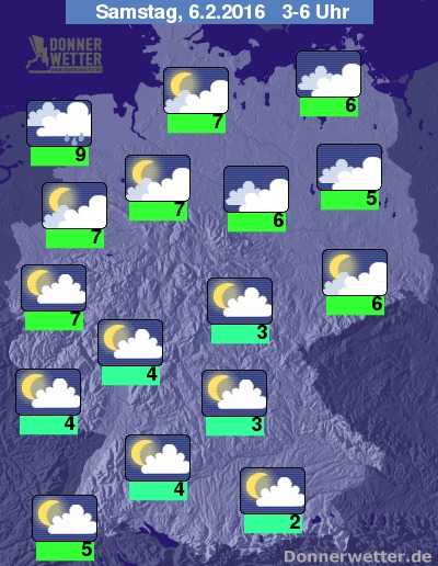 In der Nacht zum Samstag bleibt die Wolkendecke im Küstenumfeld weitgehend verschlossen und es kann hier und da Regen oder Sprühregen fallen, auch sonst ist es im Norden überwiegend stark bewölkt, dazu jedoch weitgehend trocken. Von der breiten Landesmitte bis in den Süden der Republik zeigt sich der Himmel meist locker bis aufgelockert bewölkt und es bleibt trocken. Die Temperatur sinkt auf 9 Grad in Ostfriesland und etwa 2 Grad in Augsburg. An der Nordsee weht starker Wind.