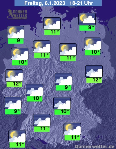 Heute Abend lockert die Bewölkung hier und da, vor allem im Norden etwas auf. Es bleibt weitgehend trocken bei Werten von 9 Grad in Neubrandenburg und 12 Grad in Bonn.
