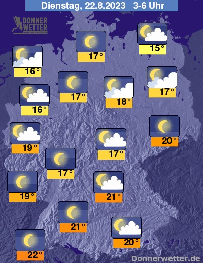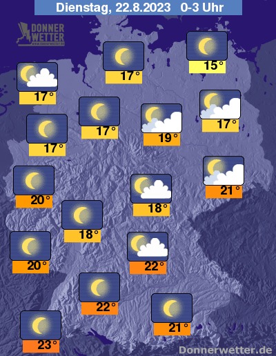 In der Nacht auf Dienstag zeigt sich der Himmel sternenklar oder nur gering bewölkt, in der Osthälfte sowie im Umfeld der Nordseeküste kann es auch aufgelockert bewölkt sein. Es bleibt trocken.