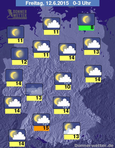 Die Tiefstwerte liegen bei 15 Grad C am Bodensee und um 8 Grad an der Ostseeküste.