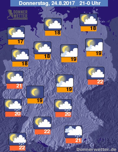 In der ersten Nachthälfte muss vor allem in der Südhälfte noch mit letzten Schauern gerechnet werden. Weitere Gewitter bleiben jedoch aus und auch die Schauer lassen im Lauf der Nacht nach. Ansonsten ist der Himmel meist nur leicht bewölkt und zum Teil sternenklar. Die Tiefstwerte liegen am frühen Morgen zwischen 12 Grad im Thüringer Bergland und knapp 20 Grad in Baden.