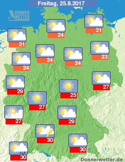 Der Freitag bringt landesweit viel Sonnenschein. Erst in der zweiten Tageshälfte bilden sich im Südwesten Quellwolken und lokal kommt es zu gewittrigen Schauern. Die Höchstwerte liegen zwischen 21 Grad an den Küsten und schwül-heißen 30 Grad und mehr im Süden.