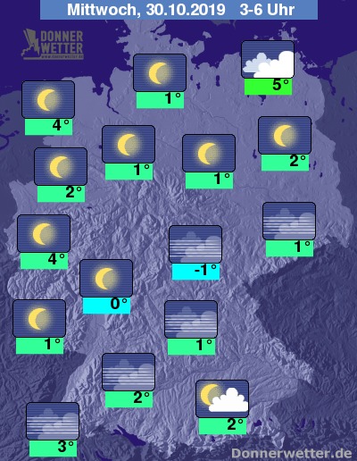 Während der zweiten Nachthälfte fällt in den Alpen stellenweise Niederschlag, sonst bleibt es häufig sternenklar. Lediglich in der Uckermark halten sich teils dichtere Wolkenfelder. Gebietsweise bildet sich Nebel.
