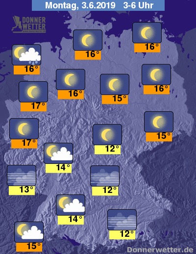 In der Nacht zum Montag ist der Himmel meist sternenklar, gebietsweise können vorübergehend auch dichtere Wolken durchziehen dazu bleibt es aber trocken. Erst gegen Morgen ziehen westlich von Niederhrein und Ems dichte Wolken auf, die im Verlauf einzelne Schauer und Gewitter bringen können. Die Temperatur sinkt auf 17 Grad im Münsterland und bis 12 Grad am Bayerischen Wald.