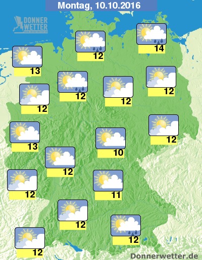 Am Montag erwartet uns meist ein Sonne-Wolken-Mix bei überwiegend trockenem Herbstwetter. Dichtere Wolken halten sich allerdings über weite Strecken des Nordens sowie am Alpenrand, hier bilden sich auch gebietsweise Schauer. Die Temperatur steigt auf herbstliche Werte zwischen 10 und 13 Grad.